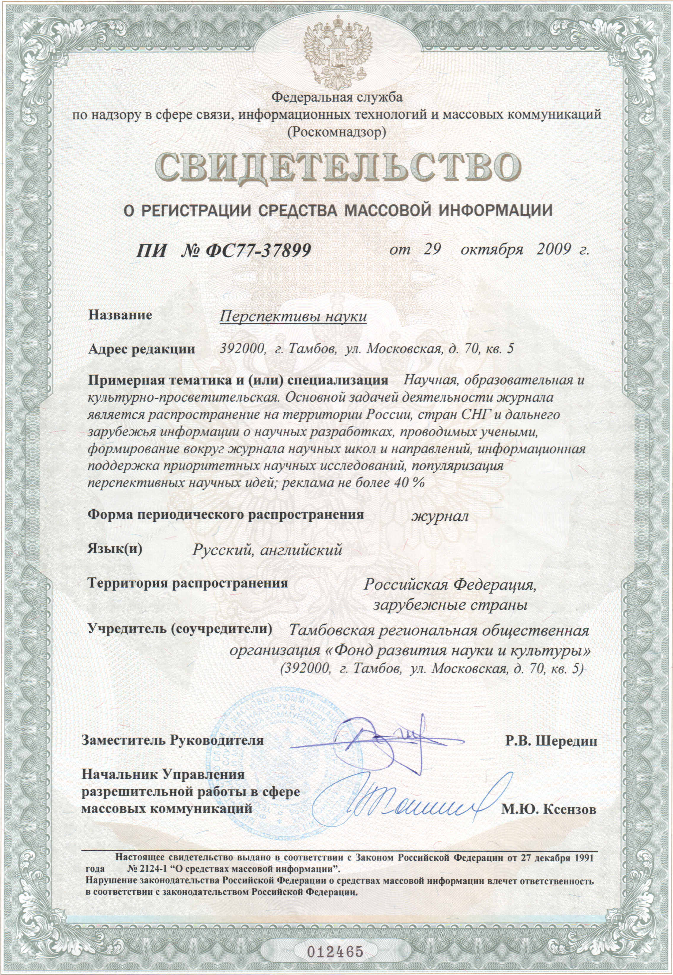 Свидетельство Роскомнадзора ПИ № ФС77-37899 от 29 октября 2009 года
